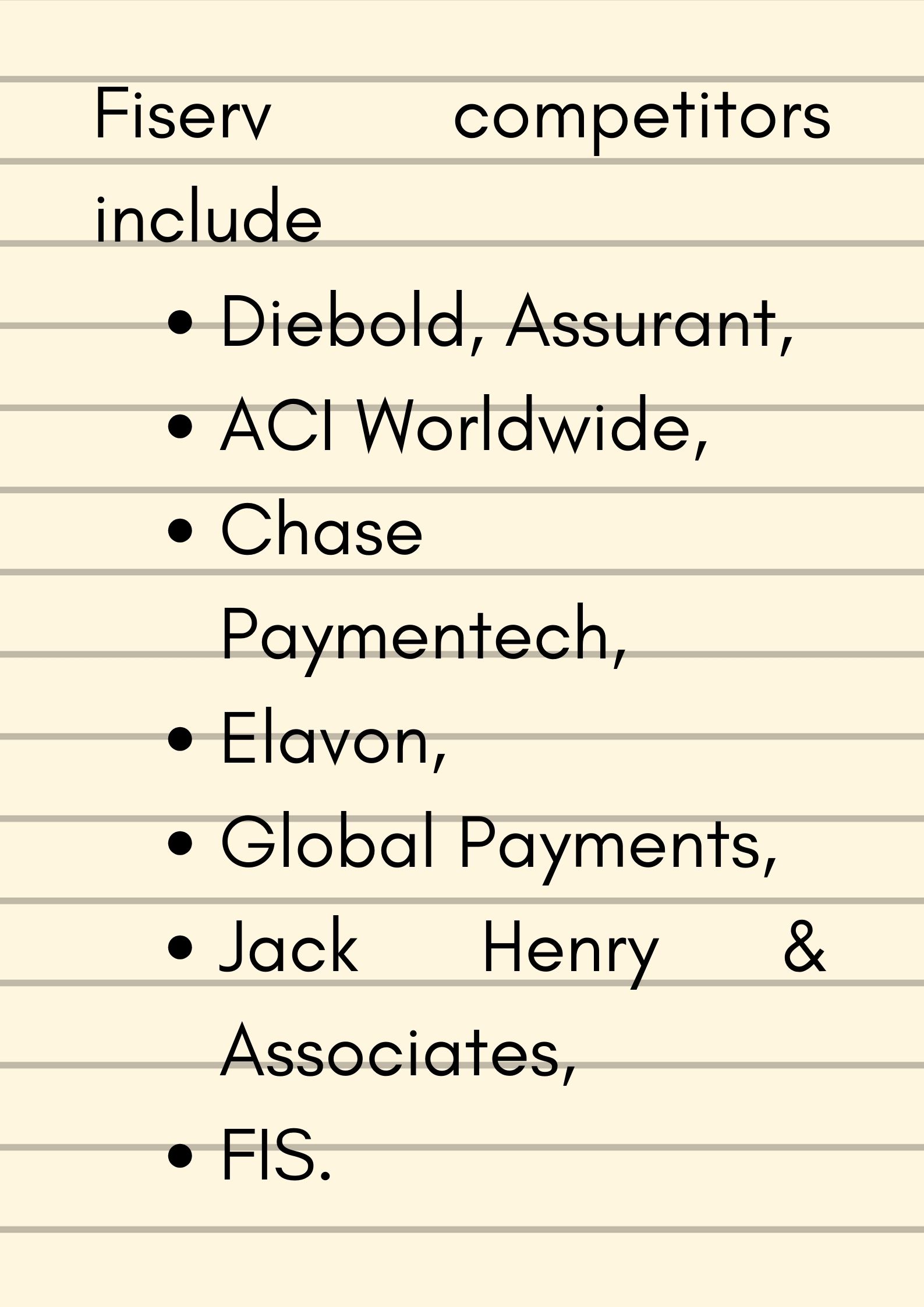 Fiserv competitors include Diebold, Assurant, ACI Worldwide, Chase Paymentech, Elavon, Global Payments, Jack Henry & Associates, and FIS.